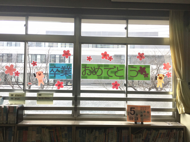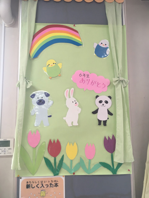 図書室内も、巣立ってゆく6年生に向けて「卒業おめでとう」のメッセージを飾りました。