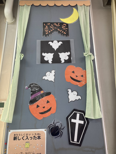 図書室の装飾は、ハロウィンへと変更です。トリックオアトリート!!