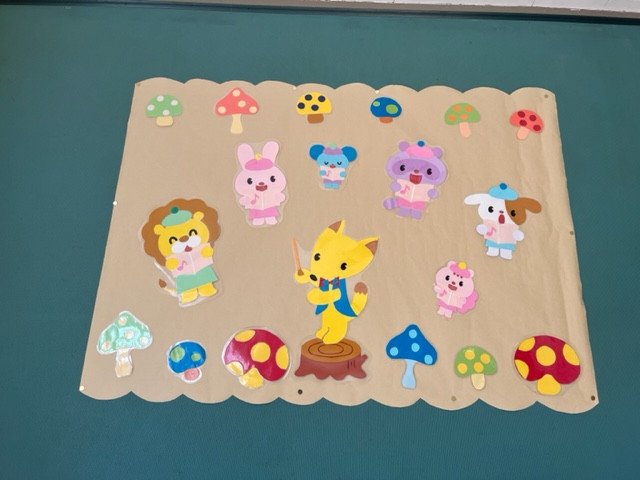 絵本コーナーの装飾は、模造紙の上下を丸く切ることで可愛らしくなりました。カラフルなきのこが楽しいですね。