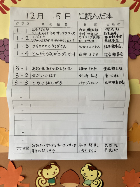 今日は1年生3年生と、けやき級の読み聞かせがありました。年内最後の読み聞かせだったので、帰り際はメンバーさんたちの間で「よいお年を!」の挨拶が飛び交っていました。コロナ禍でも無事に活動が続けられることに感謝しつつ、また来年も子どもたちに沢山の本を届けられたらと思います。