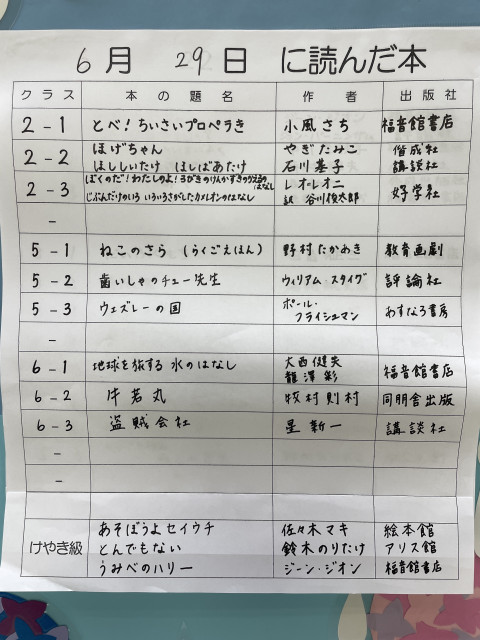 今日は、2年生、5年生、6年生、けやき級の読み聞かせがありました。