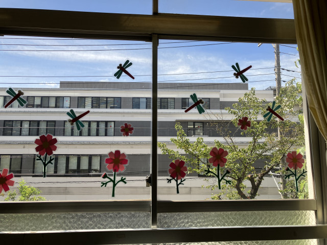 窓にコスモスやトンボ。掲示板はお月見に。図書室の中が秋らしくなりました。