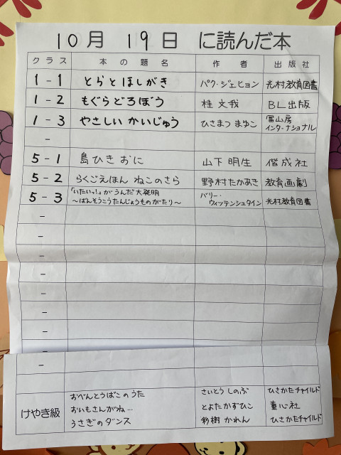 今日は1年生、5年生、けやき級の読み聞かせでした。