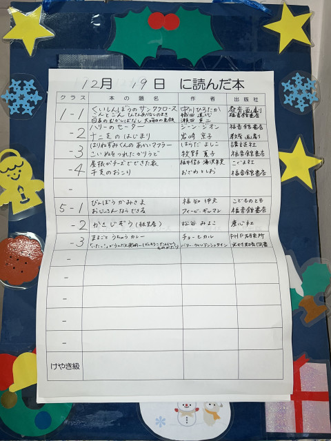 1年生と5年生の読み聞かせがありましたが、やはりクリスマスや年越し、冬などをイメージしたお話が多いようです。