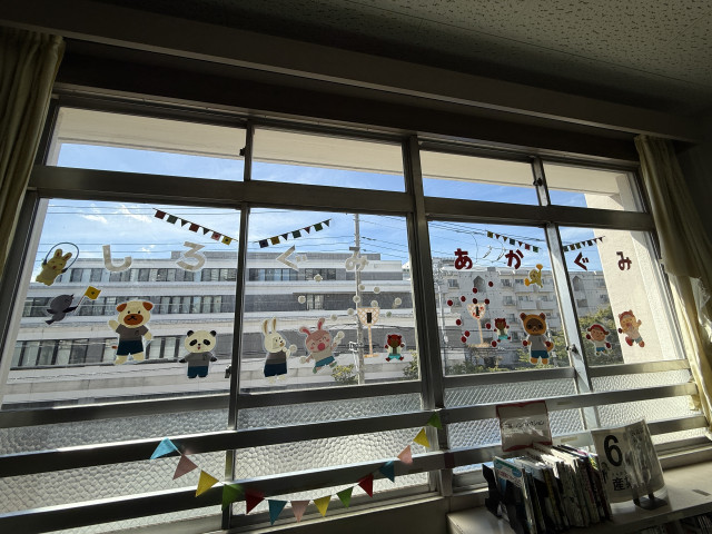 図書室の窓に飾られた動物たちも運動会の練習を応援していますよー!