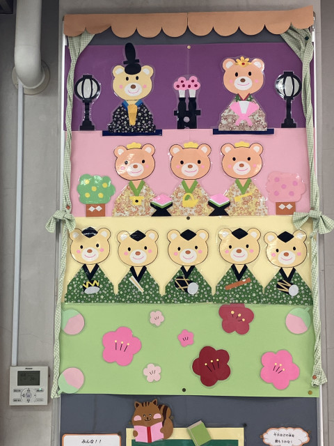 今月は、ふっくらとした梅の花に、春の訪れを告げる鶯、そして可愛らしいひな祭りの飾りが子どもたちを迎えています