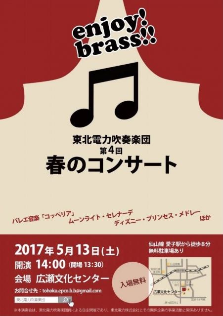 東北電力吹奏楽団では,来る5月13月(土)に「エンジョイ!ブラス!!第4回春のコンサート」と題して定期演奏会を開催します。