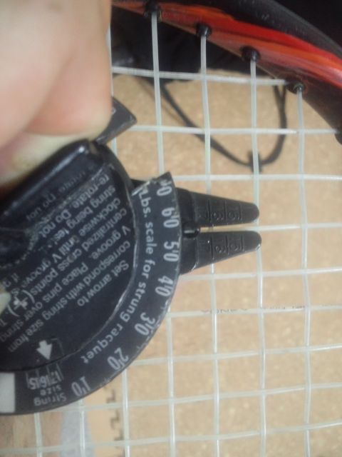さて、本題ですが。 同じテンションでストリーキングしても、ショップで感じが変わるって経験した事ないですか? 私はあります。 実際、同じストリンガー(私本人ですが)でも、使うマシーンでテンションは変わります。 秤で量ると異常ないのに不思議です。 今のマシーンに変えた当初はスクールでお借りしていたマシーンで張ってたより、少しゆるめに張り上がる傾向にありました。 ストリンガーは一緒なんですから技量の問題とは思えません。 そこで、テンションメーターを使用する事にしました。 これがどれだけ正確かは定かではないですが、一応の目安にはなります。 特に初めて預かった方のラケットに関してはストリングを張ったままで預かるようにしています。 計ってみると普通は張り上げた時のテンションより5~7ポンドぐらい落ちる事が多いです。 例えば52ポンドで張ってる方の預かったラケットは47から45ポンドぐらいまで落ちているって事です。 (このぐらいで違和感を感じるのでしょうかね?) 例えば横糸を少し落として希望する方がいますが、メーターで計る限り、横糸のテンションに依存するようです。