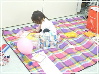 靴のまま上がる会場なのでレジャーシートを持参して簡易キッズエリアとしました。
