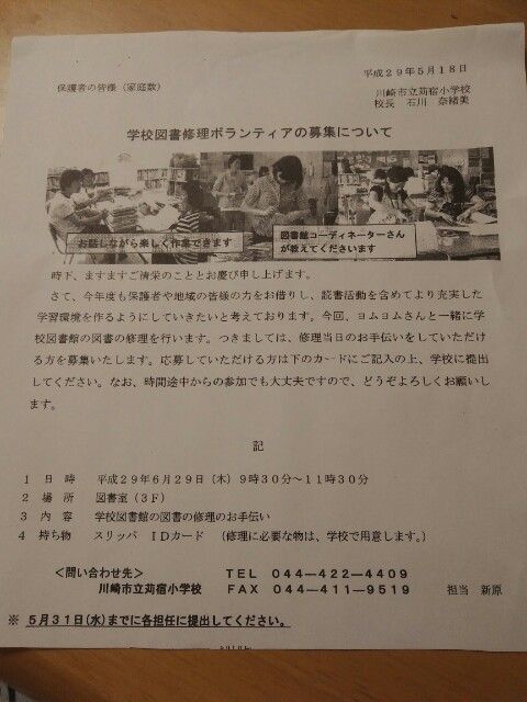 明日、6/29 09:30から学校図書館の図書の修理が行われます。