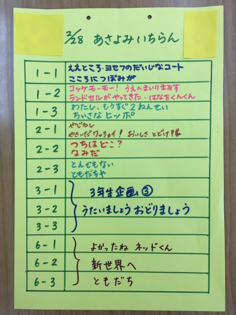 3年生企画、「かあさんのいす」3部作目で完了しました。3年生は、低学年から高学年へ、来年度から読み語りの回数が減ってしまいます。でもこれからも絵本に親しんでほしい、5年、6年の皆さんへも心に残る素敵な思い出にしてほしい、低学年はまだまだ物語の世界を旅してほしい、そんな願いでどの学年にも心を込めて、これからも読み語りは続けていきます。