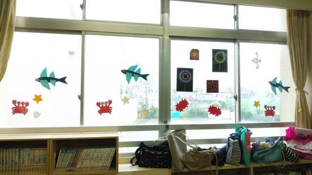 こちらは水族館にいるような雰囲気にさせる窓の装飾。ジメジメしている梅雨時期だからこそ出合える風景ですよね。来月は水族館を飛び出し、青い青い大海原を泳いでいると思います。