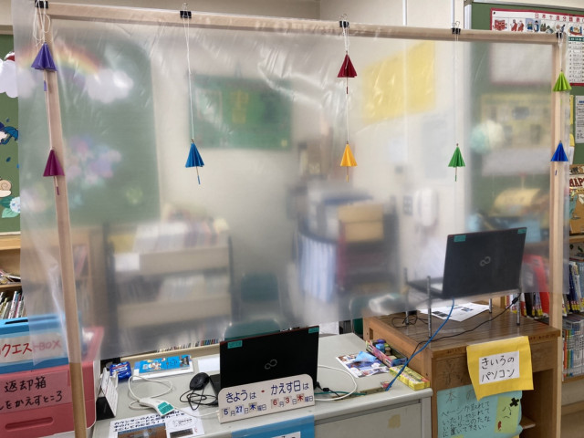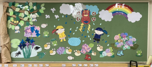 新メンバーの方達と一緒に装飾変更も行い、図書室は運動会から梅雨の雨模様へ。