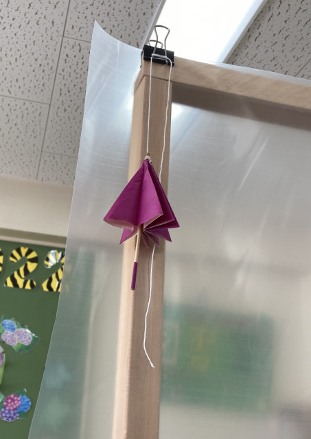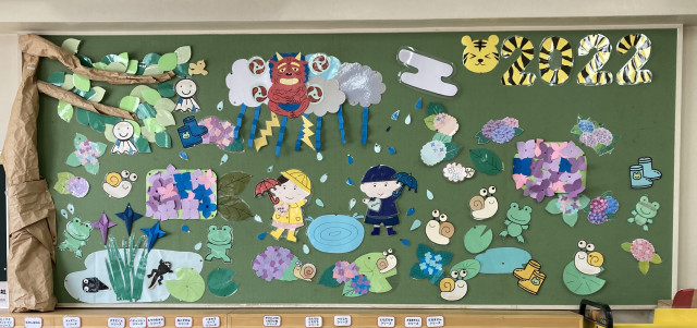 うっとうしい季節でも、こどもたちが図書室でこの装飾を見て、少しでも元気をチャージしてくれたら…。