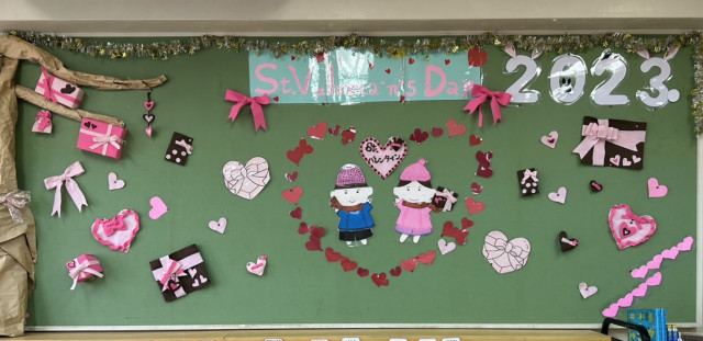 黒板の方は、2月のバレンタインデー模様に生まれ変わりました。