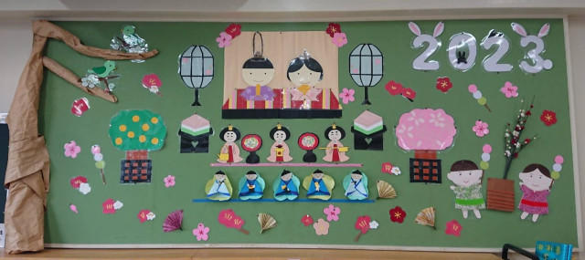 図書室の黒板は、一足早くひなまつり模様となりました。