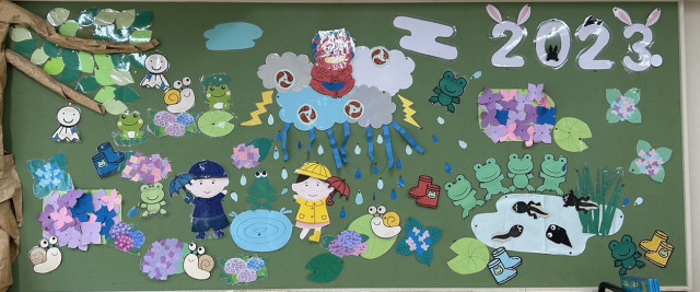5月の黒板装飾は、毎年この時期恒例の、梅雨がテーマの装飾でした。