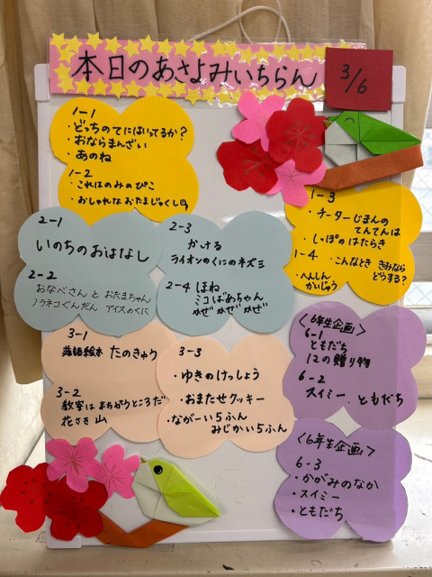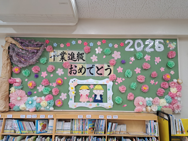 今月の黒板装飾「卒業・進級おめでとう」です。