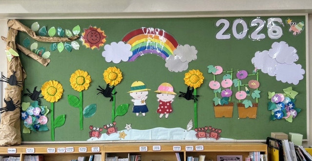 背の高いひまわりに囲まれたよむくん、ゆめみちゃん。楽しいことがいっぱいの夏休みを前に、心なしかふたりともいつもよりワクワクした表情をしているように見えます。
