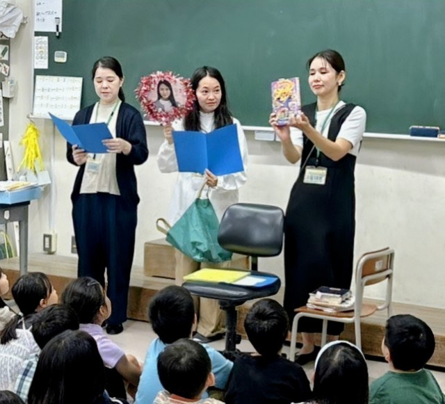 当日は先生の顔写真を貼った“推しうちわ”を掲げ、司会・読み手・サポートで息を合わせて進行。うちわは今年も子どもたちに大人気です。本の紹介にはいると子どもたちは先生方の思い出の本に「それ持ってるよ!」「知ってる!」と楽しげな声をあげていました。