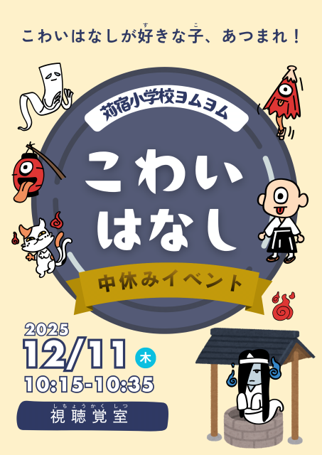 12月11日㈭の中休みに全学年の希望者を対象とした中休みイベントを行います。今年度の企画は“こわいはなし”に決定!