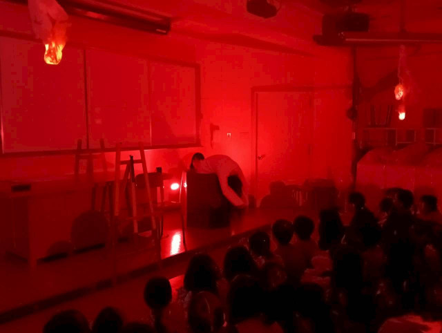 ポンプの軋む効果音とともに、大道具の井戸からは白い服を着た長い黒髪の幽霊が這い出てきました。子どもたちからは驚きの小さな悲鳴があがりました。