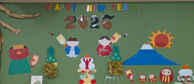 お正月の黒板装飾には、晴れ着で羽根つきを楽しむヨムくんとゆめみちゃんをはじめ、富士山に昇る初日の出、門松や鏡餅、そして来たる午年にちなんだ「2026」の見事な飾り文字まで、年のはじまりを寿ぐ明るさがぎゅっと詰まっています。短い作業時間のなかで工夫を凝らして仕上げてくださったメンバーのおかげで、図書室にも新しい年を迎える喜びが広がりました。