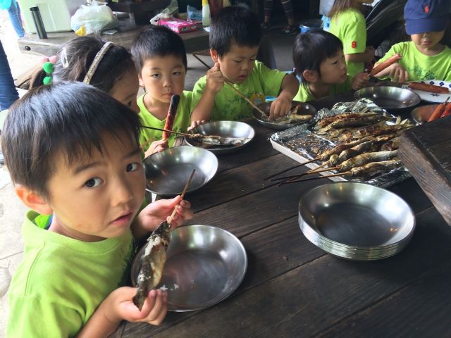 熱々の焼きたてのあゆやフランクフルトにかぶりつきます。