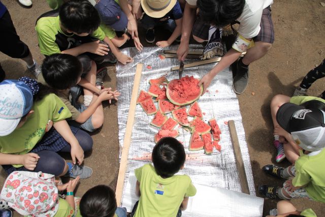 時間をかけつつ、スイカが割れた後はみんなで分けて頂きます。