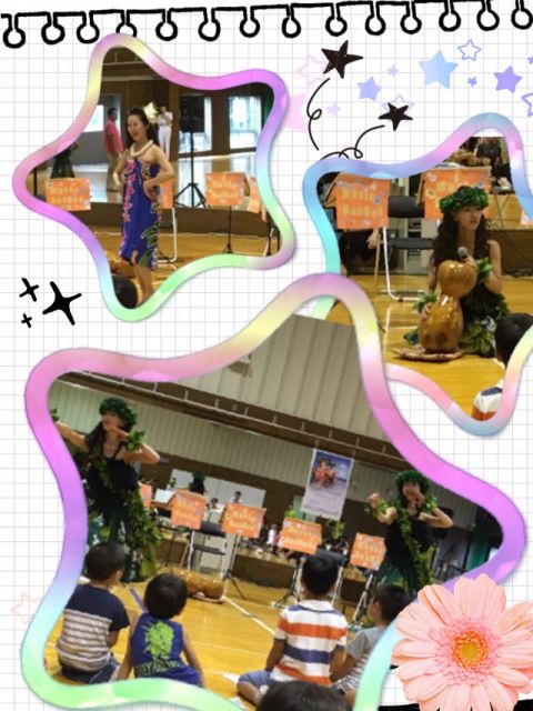 ハワイアンの衣装で美しく踊るダンサーに口を開けて見惚れるこどもたち。