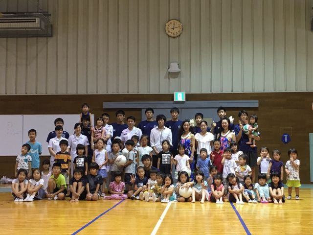 現役の大学生の技を見て、一緒にボールを触らせてもらい、子どもたちは大興奮!