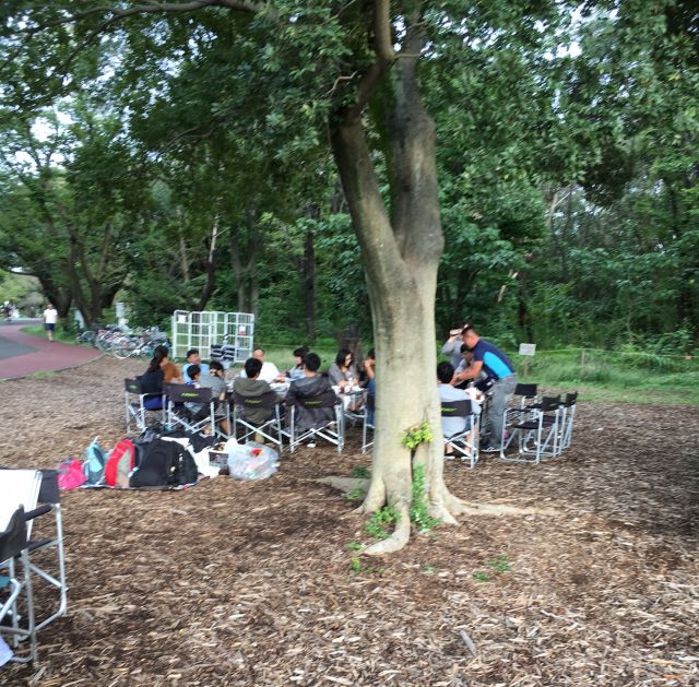 練習後バーベキュー。バーベキューの頃にはすっかり晴天となっていました。