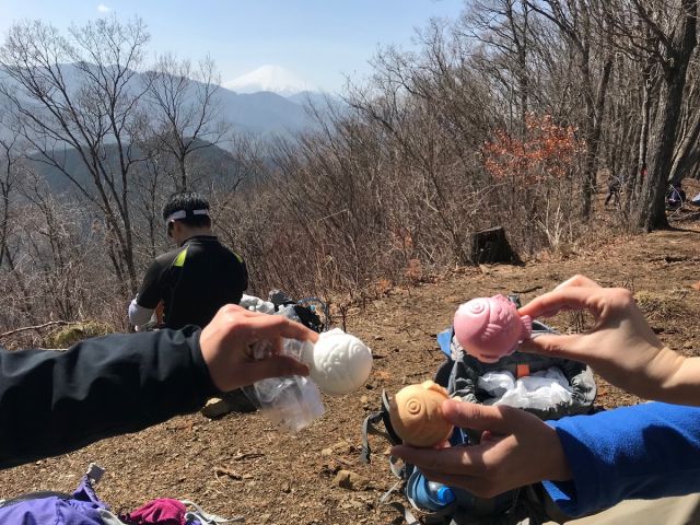 高畑山の頂上では、早くから登ったかいがありまだ大気が澄んでいて、富士山は秀麗。この時期のせいか、後で到着する倉岳山よりハッキリと見えました。山行を土曜から日曜日へ変更して正解!天気良し! 女子三人が富士山に向かって大満足。