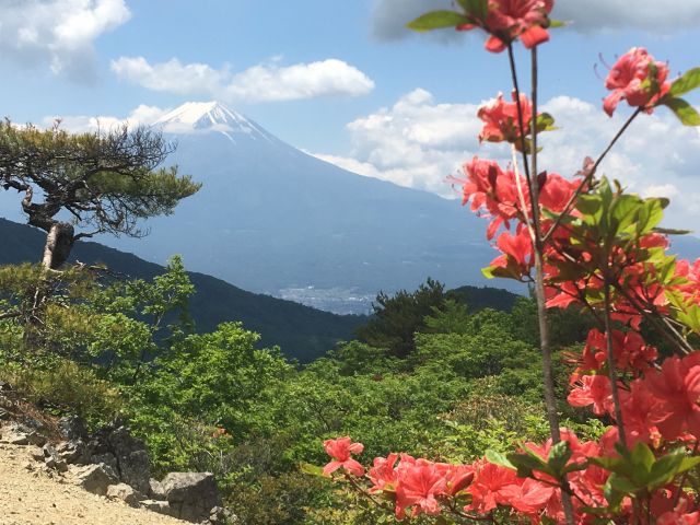 当初コースに入っていなかった清八山は、同じ秀麗富嶽十二景の山だということで清八峠から急遽寄ることに、山頂へ行くとまたヤマツツジが咲いていて、到着した時は雲に隠れていた山頂が顔を出し富士山と一緒に撮ったり、集合写真を撮りました。