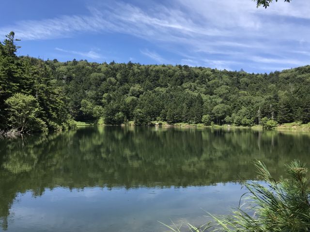 青天そして弱い風と好条件に恵まれた双子池の景観はまるで東山魁夷の絵画のように、ゆるやかな林の輪郭が翠色の湖面に映りこんでいました。
