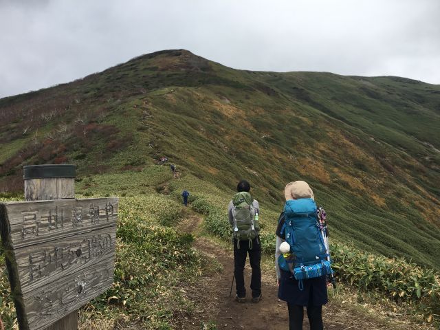 視界が開けてきました。平標山頂へ続く稜線と、赤や黄色に色づいた紅葉を楽しみながら松手山へ朝は青空だった空が雲に覆われはじめました。