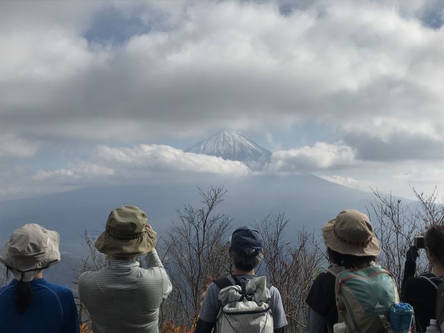 紅葉した木々を横目に登山口から1時間20分ほど登ると鍵掛峠に到着。眼下には里と西湖が見えました。峠を少し越したところで昼食を済ませ、山頂に向け再び歩き始めました。ここから山頂まではアップダウンと痩せた道。先月の台風で倒木(?)した木をまたぎ、時にはくぐり、そしてトゲのある植物に至る所でひっかかり(トゲは本当に痛かった)、細い登山道の真ん中には突如現れた動物の大きな糞があり!、アスレチック気分で歩きながらやっと山頂到着しました。しばらく経つと、富士山にかかっていた雲が突然はれ、この瞬間を逃すまいと、急いでカメラを出して再度撮影を。嬉しい瞬間でした。