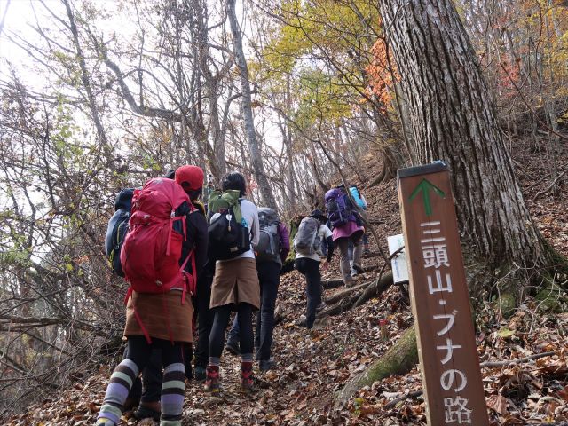 武蔵五日市駅集合。最近私は集合時間より30分近く早く到着してしまいます。案の定、駅の女子 トイレは長い行列でした。これからバスには1時間近く乗るので切実な問題。トイレを済ませまだ 誰も来なさそうなので、1人で朝の駅前の風景を見ながら稲荷寿司を2個食べました。バス停1番 乗場は早くも行列を作り始めていたので来た順に並び始めました。どんどん列は長くなるので、 参加者11名が到底同じバスに乗れないと思われました。増発3台合計4台のバスが出るとのアナウ ンス。紅葉の時期の週末はこんなにも壮絶なんだと驚きました。 参加者の中では前の方に並んでいた私を含め3人。当然、終点の都民の森に1番早く到着するはず の1台目のバスに乗れたと3人とも思っていました。ところが、都民の森に着いたら、もうみんな 来てる!しかも駐車場の女子トイレはまたもや大行列! 後続のバスにいつ抜かされたんだろ う?!。。。本日最初のマジック(-.-;)y-~~~