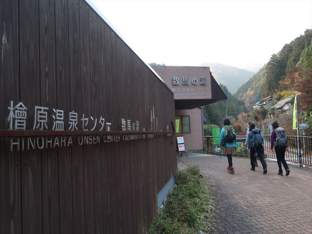 ムシカリ峠方面に下り、大きな構えの三頭山避難小屋のトイレを借ります。私はここ でやっと気が付きました、靴ひもが朝家を出る時のいいかげんな締め方のままだったことに。た るみ過ぎ! 何だか眠くもなってきました。槇寄山を目指して黙々と歩きます。この笹尾根と呼ば れる長い気持ちのいい尾根を生藤山まで歩いてみたいな、と常々思うのですが、長過ぎて日帰り じゃ、バスの時間が終わってしまうので、トレランじゃない限りなかなか難しそうです。 リーダーの提案で槇寄山から直接仲の平に下りることにしました。車道を少し行けば、すぐ数馬 の湯温泉センターです。ゴール!