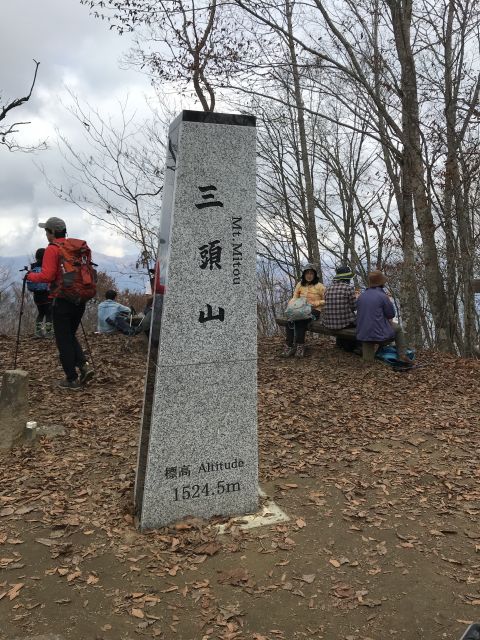 最後に登場、1番人気の広い西峰。なんと、ど真ん中に背の高い三角の石の標識が最 近建てられたようで。立派過ぎる!人がどんどん来るので集合写真を先に撮り、待ちに待ったお 昼にします。人が多すぎて、11人の場所選びに迷いました。食べ始める頃、太陽出てきました。 ちょうど汗冷えで寒く感じる頂上でのひとときに、タイミング良すぎでしょう!。。。マジック その3。