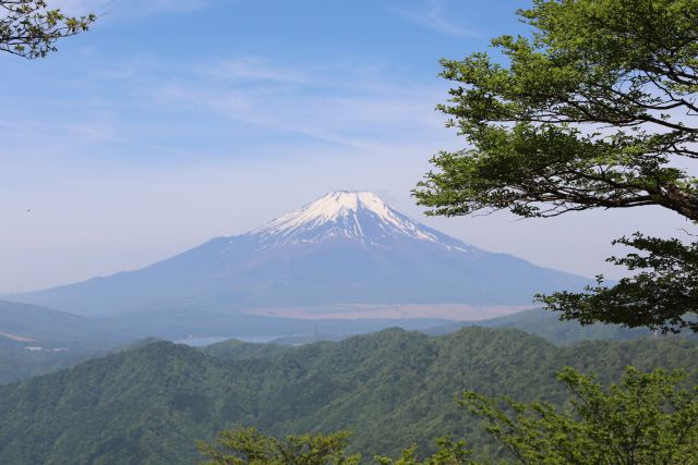 途中、富士山が木々の間から見えてきて、みんなテンションが上がります。アップダウンを繰り返し、菰釣山(こもつるしやま)へ到着しました。ここでは、西側の眺望が良く富士山もばっちり見えました。ここで休憩をしたあと、また縦走を進めます。気持ちの良いブナ林の中を歩き、とても気持ちの良い山道でした。途中昼食を取り、その後も下りと登り返しを繰り返して、だいぶみんな疲れがたまってきました。