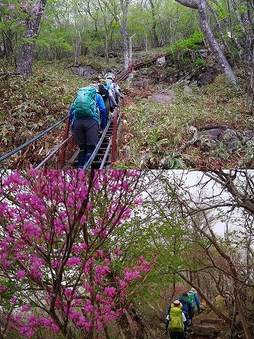 駒ケ岳から黒檜山へ見上げた稜線は、雲で覆われ望めないものの山道沿いには2mほど丈のオレンジ系色のツツジが多く咲いていて花を楽しむ事ができました。
