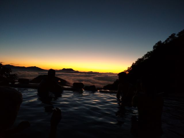 朝焼けと御来光が周囲の山々を照らしだし一体化したような風景が広がり、そんな絶景を見ている内に露天風呂の中でも一体感が生まれ、皆で朝日を拍手で迎えました。