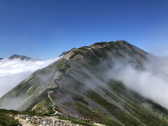 この日も快晴で昨日歩いた白馬鑓からの稜線が見渡せます。眼下の望む雲海をみな思い思いに写真を撮り、本日の工程は3日間で一番長いので三国峠へと先を急ぎます。