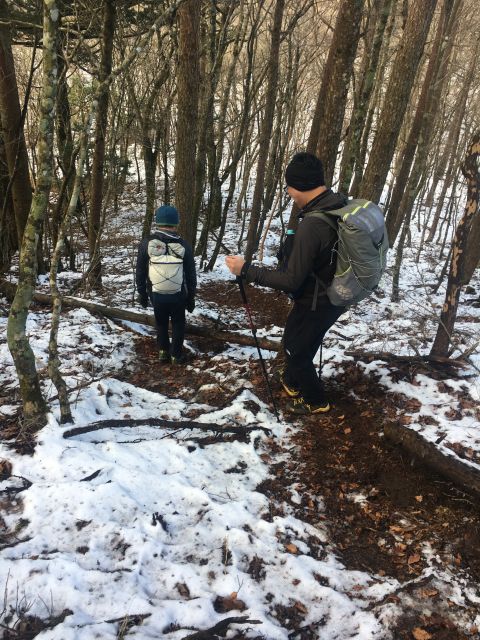 くだり道も雪やらぬかるみで気が抜けない。10月の台風の影響か、時々大きな木が倒れていて、域手を阻むも、リーダーが声をかけてくれるので安心~♪