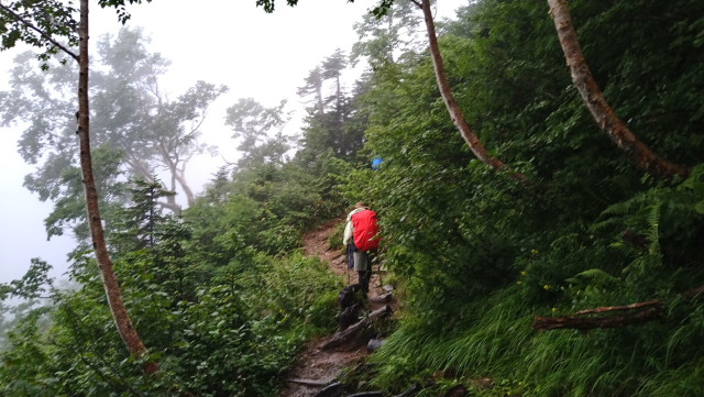 また沢と合流し離れたり、お昼を食べたり、雨具を脱いだり、また着たりしながら上を目指すと、こんどはどんどんどんどん雨が強くなってきます。ふと木の間から麓の田んぼが見え、…下界は晴れている‥!