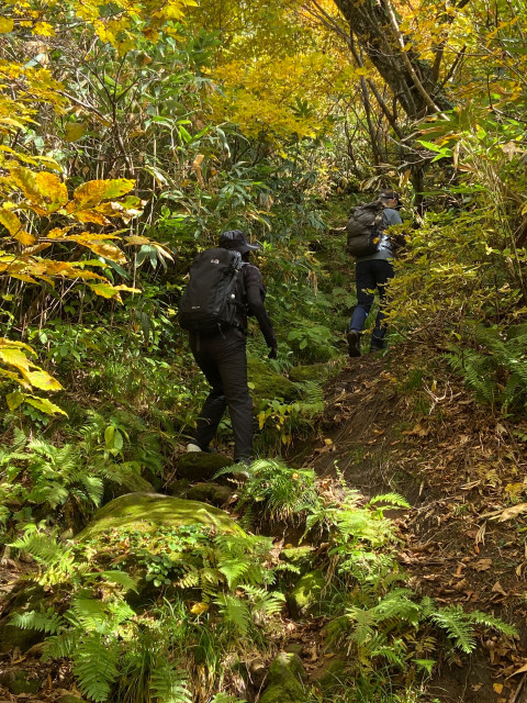 湿原が終わり黄色く色づいた木々を見ながら山頂を目指します。
