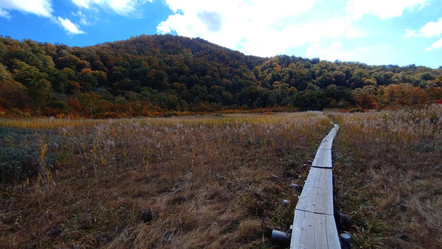 木道から見える湿原や、山頂付近、周りの山は紅葉の見頃を迎えて青空に映えます。