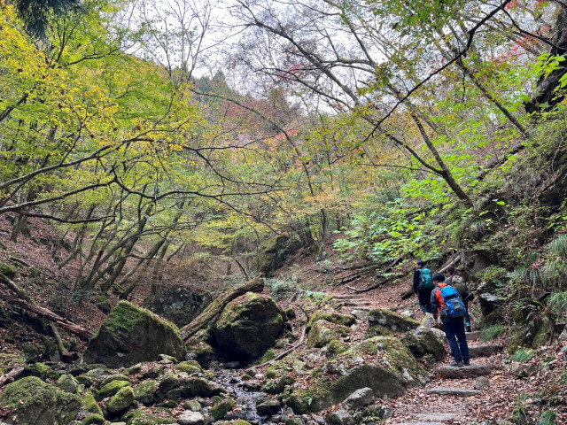 ケーブルカーは往復↔︎のチケットを購入し乗車。御岳山駅に到着し、御岳平で小休止して写真をパシャリ。AM10:00だね〜と出発。表参道を歩いて行くと、神代けやきが見え、のんびりのんびりと歩く。すぐに武蔵御岳神社が見えてきた。お清めしてから、みんなで参拝する。奥宮遥拝所の紅葉は、キレイに色づいていた。長尾平の分岐から急坂を下り、七代の滝へ。ひとしきり滝を眺めてから、鉄階段を上がり天狗岩に。天狗岩には登らないとっとなり、ちょっとの鎖を掴んで岩のてっぺんへ。鼻天狗と烏天狗がいらっしゃった。天狗岩を降りて、ロックガーデンへ。岩々を通り過ぎるせせらぎの音は、ちょっとずつ響きが違うなぁと感じながらサクサク歩く。