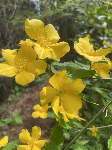 梅の木平バス停からニリンソウ群生地へ向かう道は、沢沿いに歩く楽しい道でした。ニリンソウ、ヤマブキ、ボケなどさまざまな花々が咲いていて、春をたっぷり感じました。